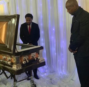 EFF spokesman Mbuyiseni Ndlozi viewing Robert Mugabe’s body at the Mugabe residence on Monday while Simba Chikore, the former president’s son-in-law, looks on